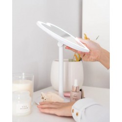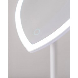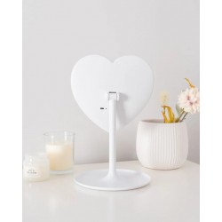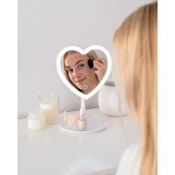 Espejo con forma de corazón y luz LED. Cuenta con una base que puedes utilizar para almacenamiento de joyas, cosméticos etc., y con un botón táctil en el espejo para regular la intensidad.